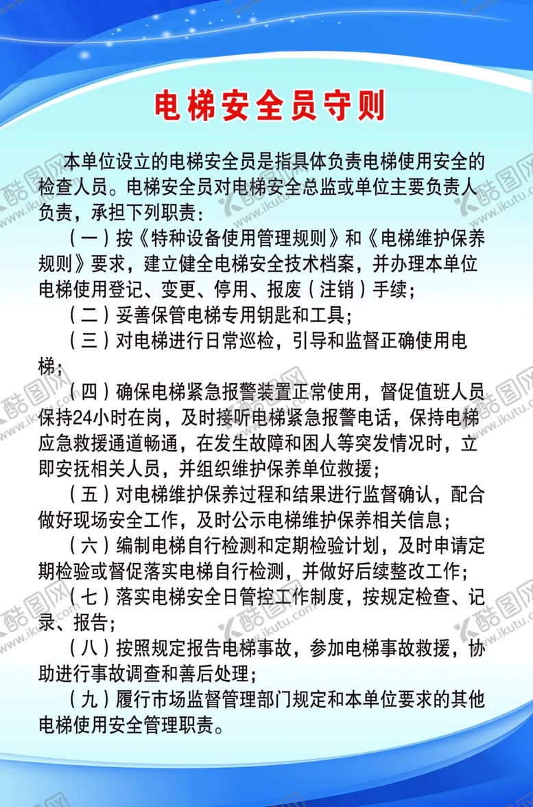 共享素材,尺寸大小是2303*3484像素,电梯安全员是由平面广告设计师tecra1234上传,浏览本次作品的您可能还对电梯,安全员,守则,电梯安全员,制度牌,平面广告,,平面广告感兴趣。