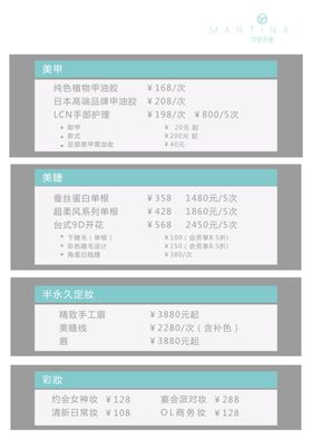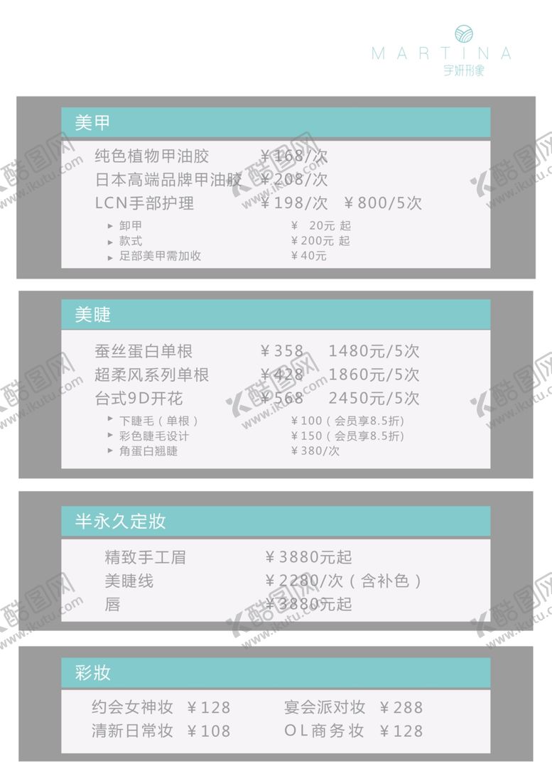 共享素材,尺寸大小是2480*3508像素,宇妍形象特色表是由平面广告设计师jingjing17_上传,浏览本次作品的您可能还对宇妍形象,特色表,价目表,项目表,美甲,美睫,半永久定妆,彩妆,简单版面,清新版面,平面广告,,平面广告感兴趣。