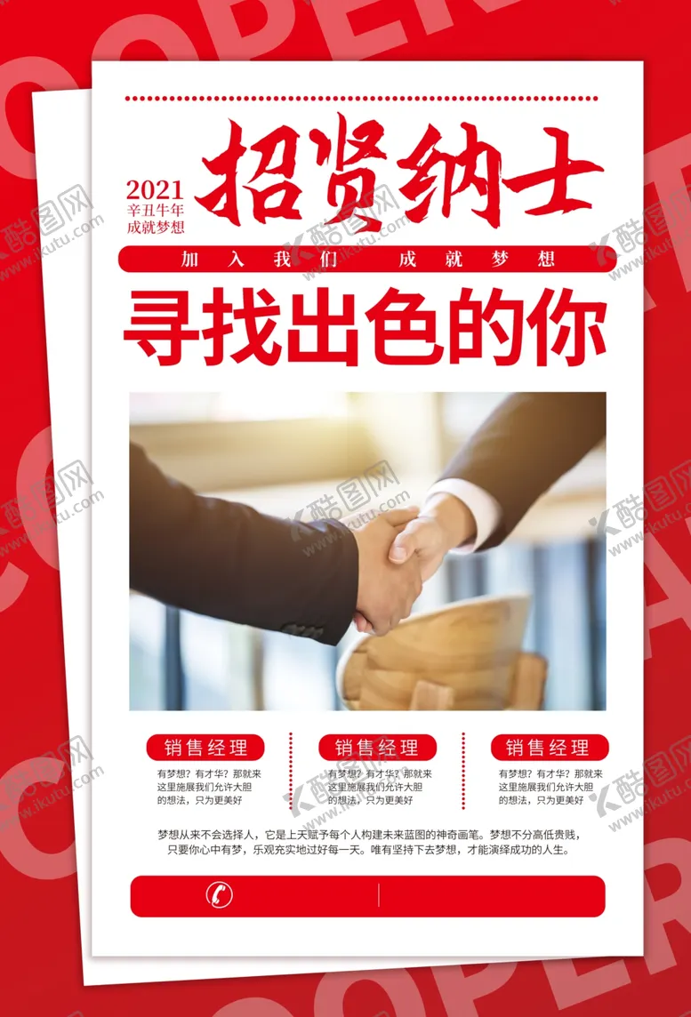 酷图网为你提供精美好看的素材模板下载,本次平面广告作品主题是招聘,素材ID编号是64814703250817212638,格式是PSD,建议使用打开编辑,或是"通过网上查询一下对应格式的打开软件";该招聘素材大小是37.65 MB,素材主要颜色以白色为主,素材分享方式属于