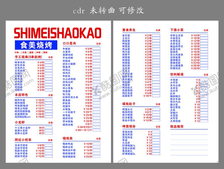 酷图网为你提供精美好看的素材模板下载,本次平面广告作品主题是烧烤菜单,素材ID编号是66033310311424315312,格式是CDR,建议使用打开编辑,或是"通过网上查询一下对应格式的打开软件";该烧烤菜单素材大小是88.31 KB,素材主要颜色以白色为主,素材分享方式属于