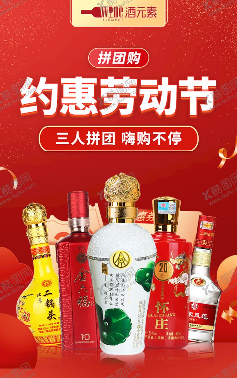 原创共享素材,尺寸大小是750*1193像素,五一劳动节 白酒海报 拼团是由平面广告设计师iyt1713上传,浏览本次作品的您可能还对酒元素,拼团购,劳动节海报,白酒海报,酱香酒,浓香酒,五粮液,二锅头,金六福,优惠,活动,活动海报,氛围,促销,,平面广告,,平面广告感兴趣。