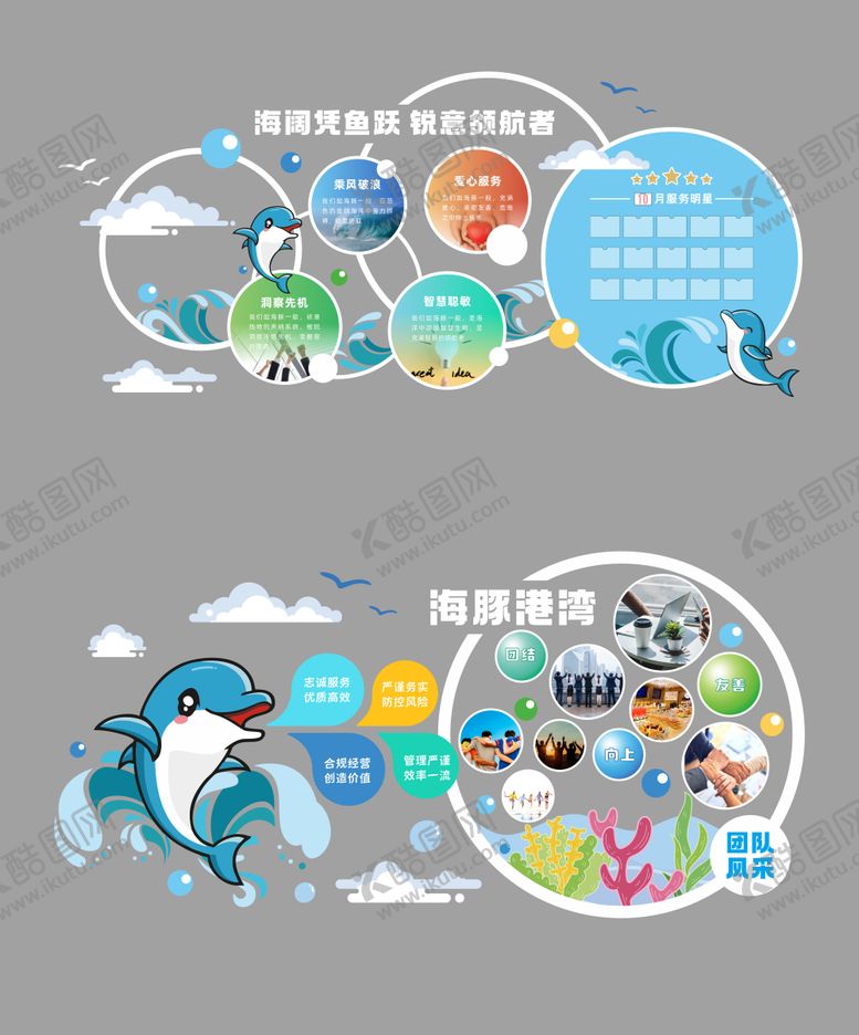 酷图网为你提供精美好看的素材模板下载,本次平面广告作品主题是海洋海豚领航团队文化墙,素材ID编号是67302111210550527769,格式是CDR,建议使用打开编辑,或是"通过网上查询一下对应格式的打开软件";该海洋海豚领航团队文化墙素材大小是13.07 MB,素材主要颜色以灰色为主,素材分享方式属于