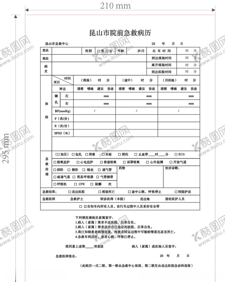 酷图网为你提供精美好看的素材模板下载,本次平面广告作品主题是昆山市院前急救病历,素材ID编号是69705803261249208154,格式是AI,建议使用打开编辑,或是"通过网上查询一下对应格式的打开软件";该昆山市院前急救病历素材大小是1.09 MB,素材主要颜色以白色为主,素材分享方式属于