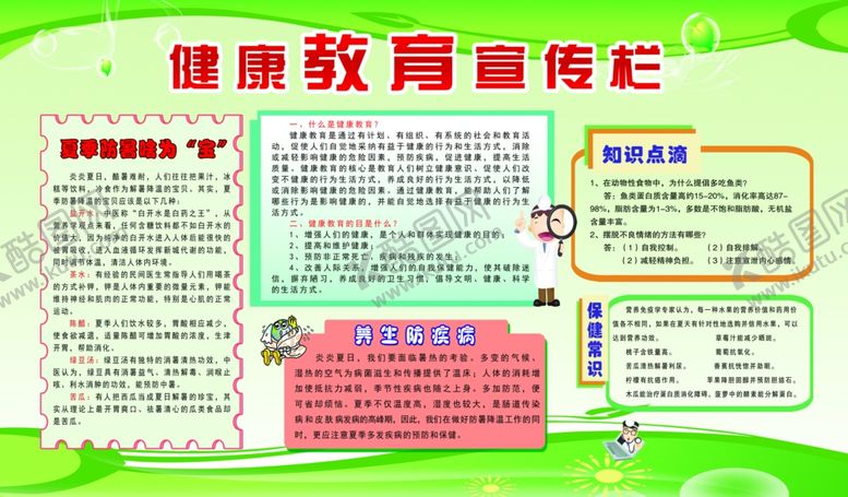 共享素材,尺寸大小是6456*3779像素,健康教育宣传栏是由平面广告设计师alimamaai上传,浏览本次作品的您可能还对夏季防暑,养生防疾病,健康教育,知识点滴,保健常识,平面广告,,平面广告感兴趣。