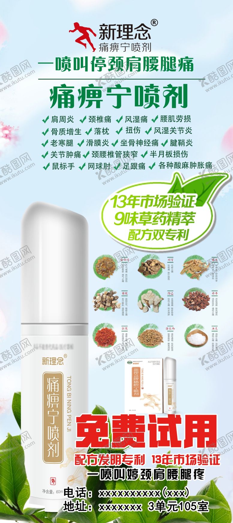 共享素材,尺寸大小是3150*7086像素,痛痹宁喷剂是由免抠元素设计师jieyses1023上传,浏览本次作品的您可能还对痛痹宁喷剂,药材图片,新理念,绿色树叶,蓝色背景,腰酸背痛,宣传单,,免抠元素,,免抠元素感兴趣。