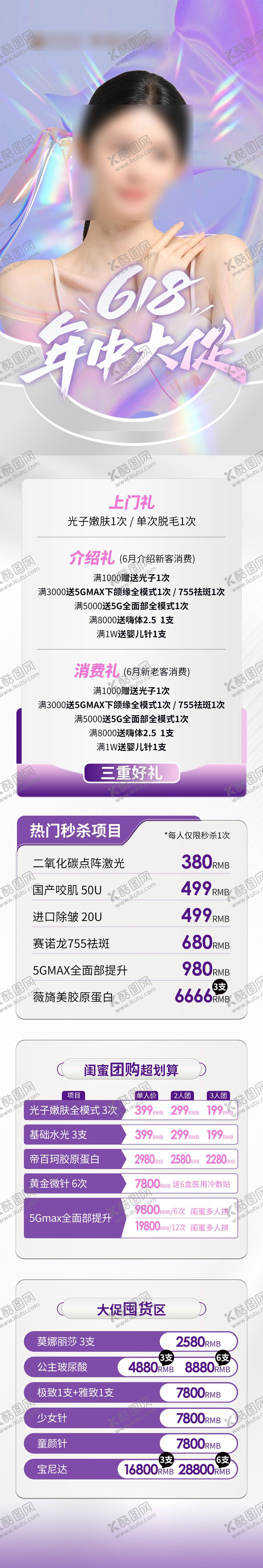 共享素材,尺寸大小是1024*6092像素,618年中大促三重礼长图是由平面广告设计师tscy123上传,浏览本次作品的您可能还对专题设计,长图,医美,618,年中大促,促销,抗衰,团购,秒杀,三重礼,,平面广告,,平面广告感兴趣。