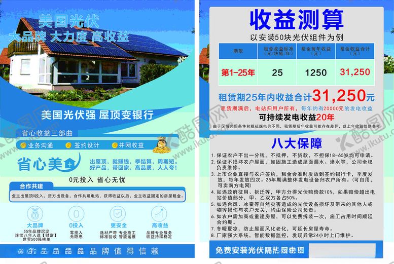 酷图网为你提供精美好看的素材模板下载,本次平面广告作品主题是光伏安装宣传单A4,素材ID编号是75119902252006388198,格式是CDR,建议使用打开编辑,或是"通过网上查询一下对应格式的打开软件";该光伏安装宣传单A4素材大小是6.44 MB,素材主要颜色以白色为主,素材分享方式属于