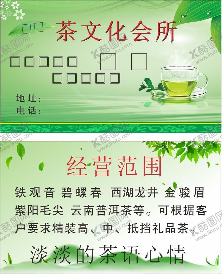 像素,茶叶名片是由平面广告设计师bravehearterdoctor上传,浏览本次作品的您可能还对名片卡片,茶叶名片,名片,名片模板,个性名片,简约名片,创意名片,茶文化,茶道,绿色名片,品茶,平面广告,,平面广告感兴趣。