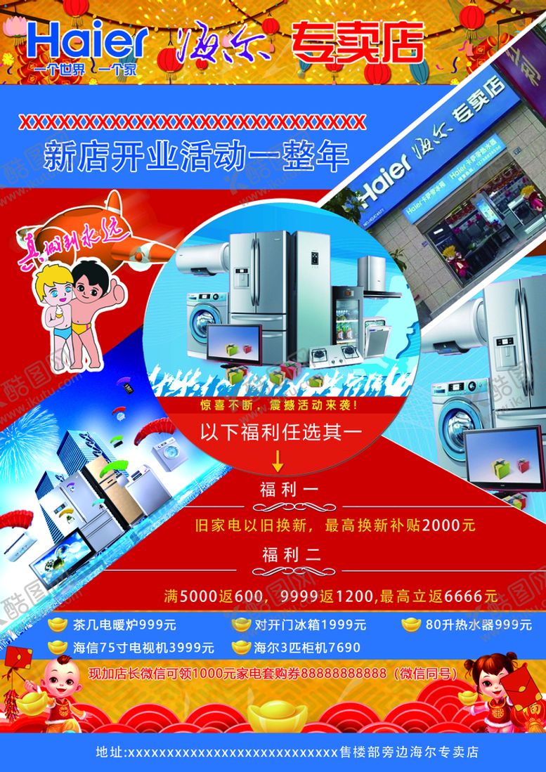 原创共享素材,尺寸大小是2421*3425像素,家电宣传单 活动传单是由平面广告设计师yiyucanqing上传,浏览本次作品的您可能还对宣传单,活动,电器,开业,海尔,展架,电器宣传展架,平面广告,,平面广告感兴趣。
