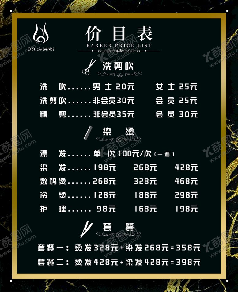 酷图网为你提供精美好看的素材模板下载,本次免抠元素作品主题是美发价目表,素材ID编号是77864011032045528004,格式是PSD,建议使用打开编辑,或是"通过网上查询一下对应格式的打开软件";该美发价目表素材大小是20.2 MB,素材主要颜色以黑色为主,素材分享方式属于