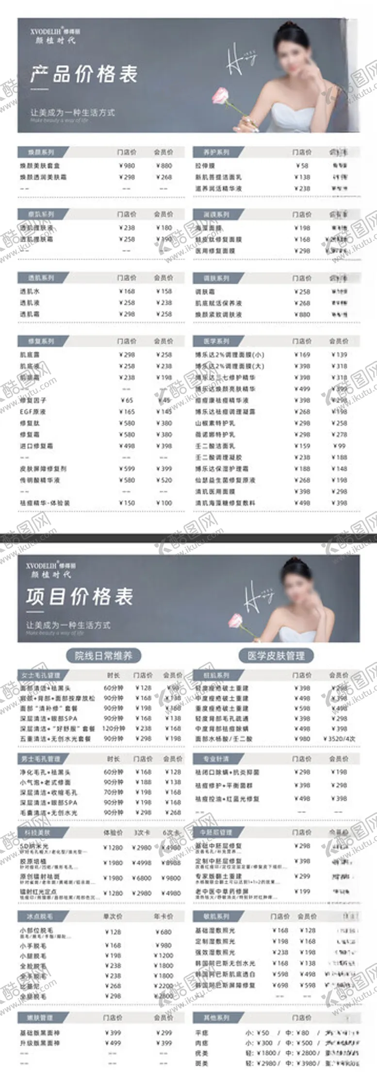 原创共享素材,尺寸大小是2400*3500像素,医美美容项目商品价格表是由平面广告设计师regrgdgdgg上传,浏览本次作品的您可能还对医美,美容,项目,商品,价格表,高端,简约,灰色,平面广告,,平面广告感兴趣。