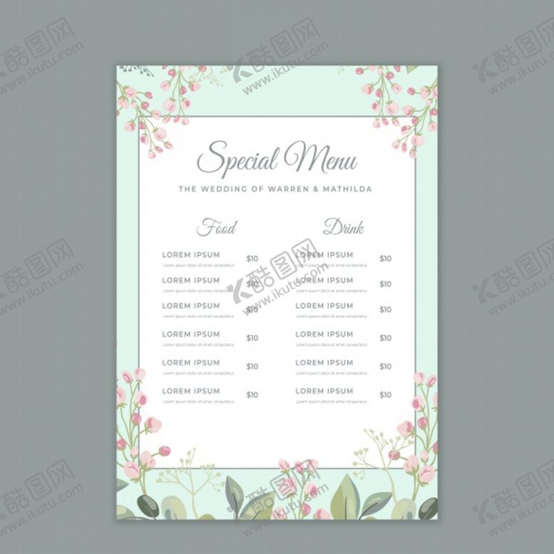 共享素材,尺寸大小是2480*3508像素,花卉婚宴菜单是由平面广告设计师olivia2上传,浏览本次作品的您可能还对婚宴菜单,婚礼菜单,婚礼,婚宴,婚礼宴席菜单,菜单,酒席菜单,设计,花卉,平面广告,,平面广告感兴趣。