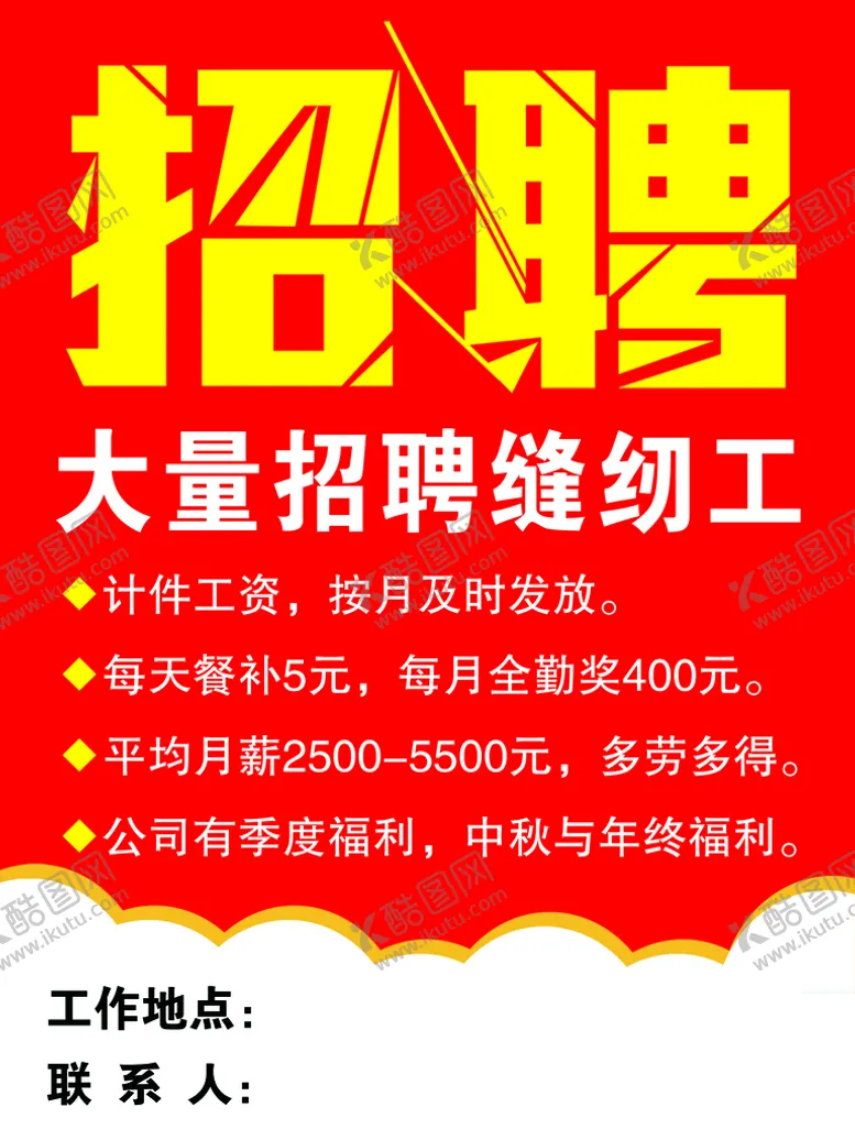 共享素材,尺寸大小是1700*2268像素,招聘是由免抠元素设计师wanglei15950225270上传,浏览本次作品的您可能还对招聘,招工,招新员工,招缝纫工,红底,白云,招员工,免抠元素,,免抠元素感兴趣。