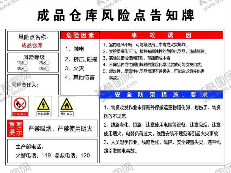 像素,成品仓库风险告知牌是由平面广告设计师chrisliuyaqin上传,浏览本次作品的您可能还对风险点告知牌,成品仓库风险,安全告知牌,告知卡,风险点,风险告知牌,,平面广告,,平面广告感兴趣。
