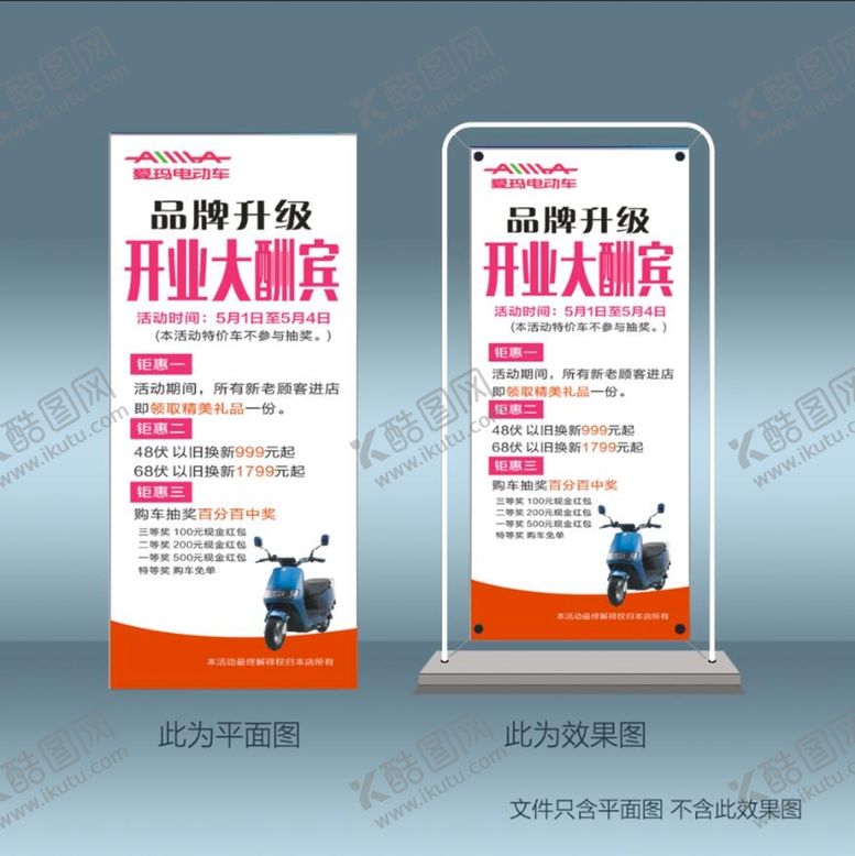 酷图网为你提供精美好看的素材模板下载,本次平面广告作品主题是爱玛电动车开业大酬宾展架,素材ID编号是81634411201006549442,格式是CDR,建议使用打开编辑,或是"通过网上查询一下对应格式的打开软件";该爱玛电动车开业大酬宾展架素材大小是627.84 KB,素材主要颜色以灰色为主,素材分享方式属于