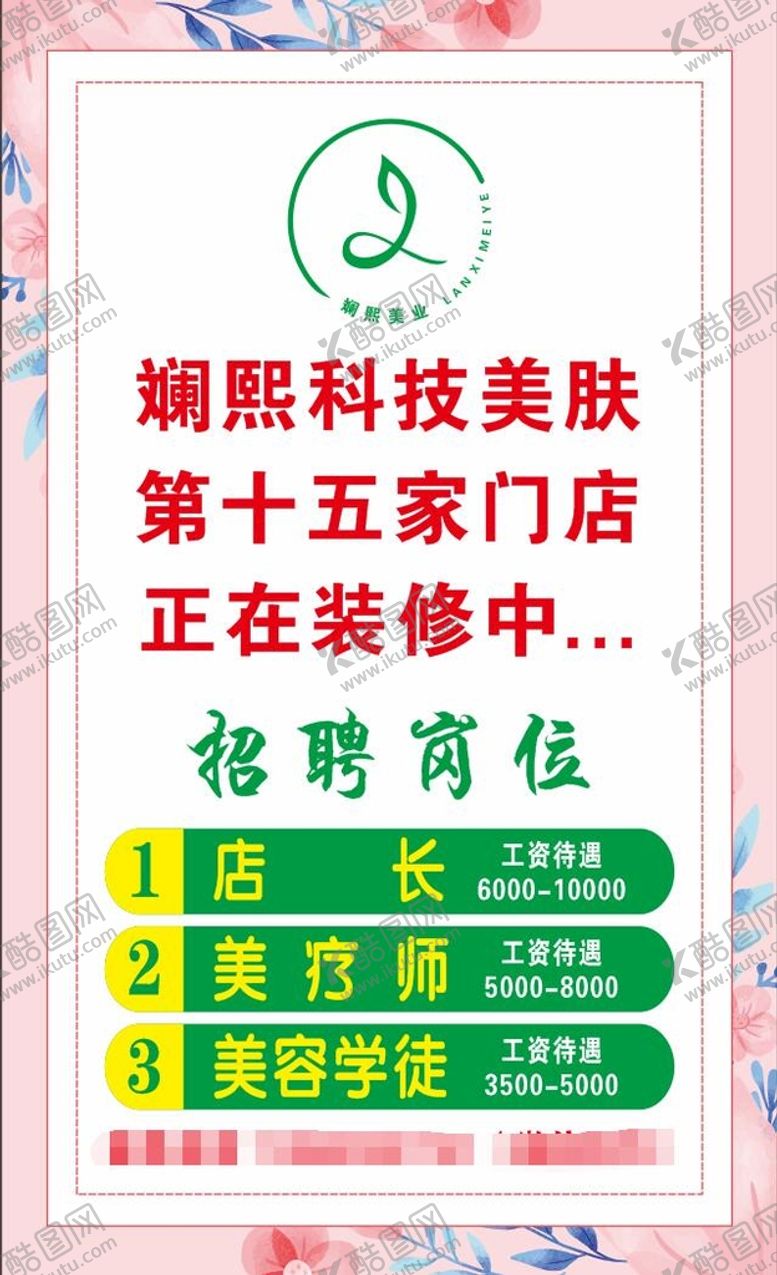 原创共享素材,尺寸大小是0*0像素,斓熙美业美容开业招聘海报是由平面广告设计师oliu1113上传,浏览本次作品的您可能还对斓熙美业,美容LOGO,开业海报,招聘海报,美容招聘,装修海报,美容装修,平面广告,,平面广告感兴趣。