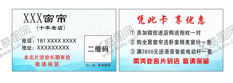 酷图网为你提供精美好看的素材模板下载,本次平面广告作品主题是蓝色简洁大气高端窗帘名片,素材ID编号是84035412281739356741,格式是CDR,建议使用打开编辑,或是"通过网上查询一下对应格式的打开软件";该蓝色简洁大气高端窗帘名片素材大小是584.01 KB,素材主要颜色以白色为主,素材分享方式属于