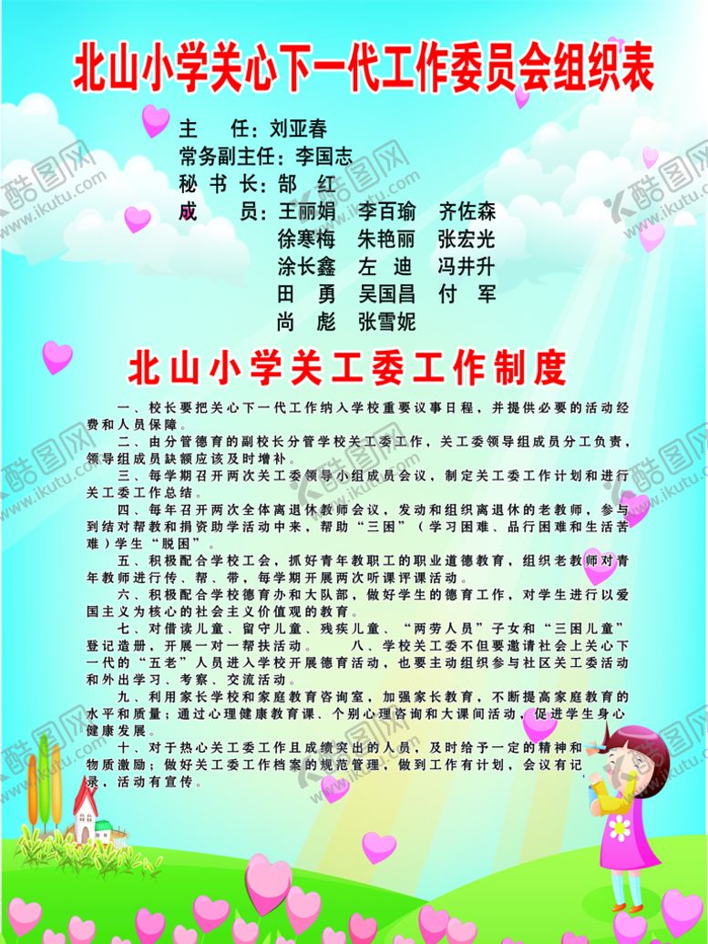 共享素材,尺寸大小是2551*3402像素,关心下一代关工委校园是由平面广告设计师tfjxy上传,浏览本次作品的您可能还对关心下一代,关工委,校园,学校,下一代,展板,平面广告,,平面广告感兴趣。