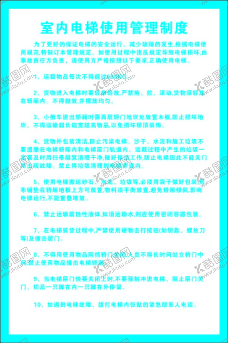 酷图网为你提供精美好看的素材模板下载,本次其他素材作品主题是室内电梯使用管理制度,素材ID编号是84760501170824507043,格式是CDR,建议使用打开编辑,或是"通过网上查询一下对应格式的打开软件";该室内电梯使用管理制度素材大小是500.99 KB,素材主要颜色以白色为主,素材分享方式属于