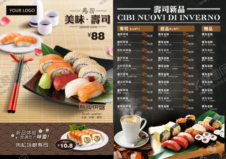 酷图网为你提供精美好看的素材模板下载,本次平面广告作品主题是寿司价目表,素材ID编号是85733702192131036909,格式是PSD,建议使用打开编辑,或是"通过网上查询一下对应格式的打开软件";该寿司价目表素材大小是61.57 MB,素材主要颜色以棕色为主,素材分享方式属于