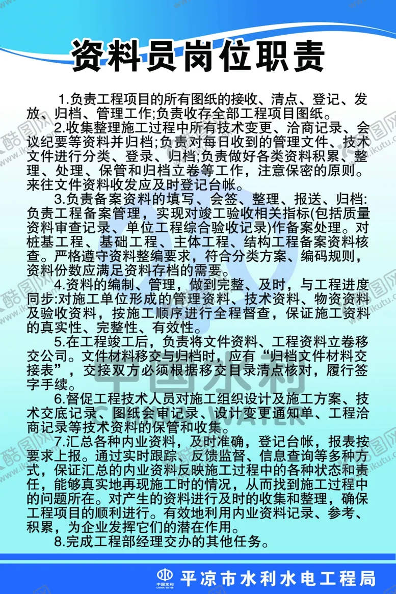 共享素材,尺寸大小是2362*3543像素,岗位职责是由平面广告设计师tianshu888上传,浏览本次作品的您可能还对资料员,岗位职责,岗位,职责,制度板,制度,规章,平面广告,,平面广告感兴趣。
