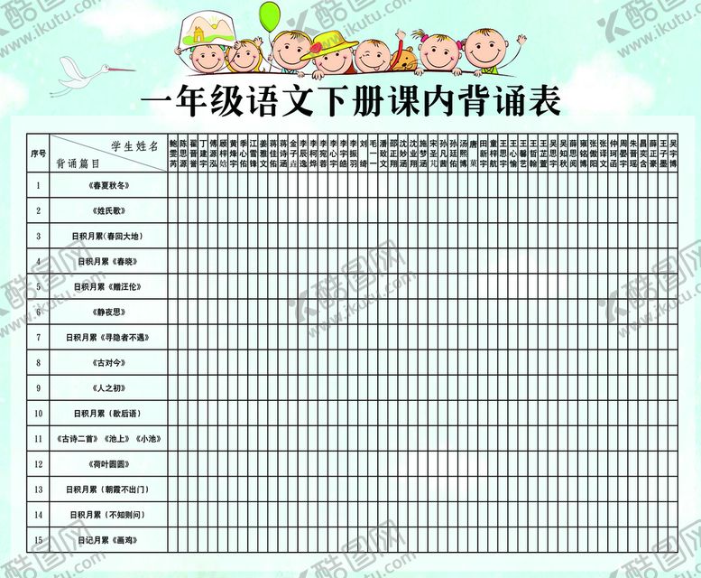 像素,古诗背诵语文课内是由免抠元素设计师ysminnpu上传,浏览本次作品的您可能还对古诗,一年级,语文,课内,背诵表,免抠元素,,免抠元素感兴趣。