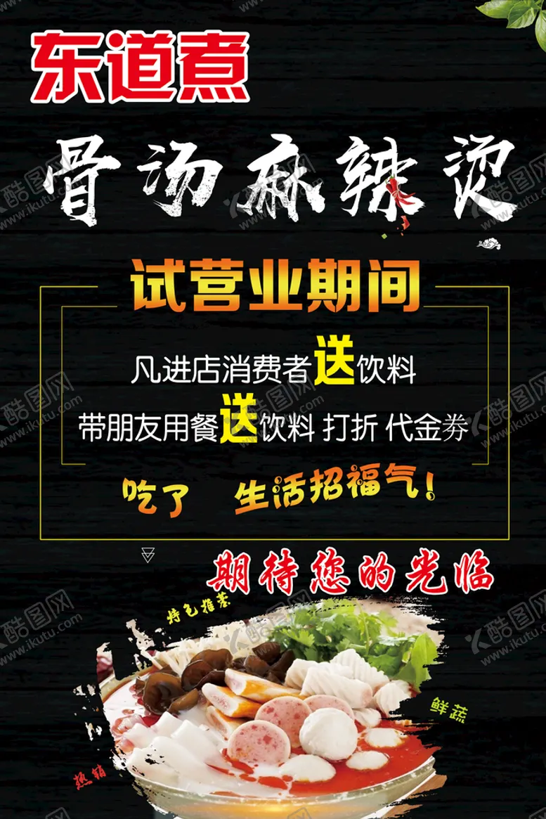 原创共享素材,尺寸大小是2835*4252像素,骨汤麻辣烫是由平面广告设计师liouyun上传,浏览本次作品的您可能还对东道煮,骨汤麻辣烫,试营业期间,吃了招福气,进店送优惠券,,平面广告,,平面广告感兴趣。
