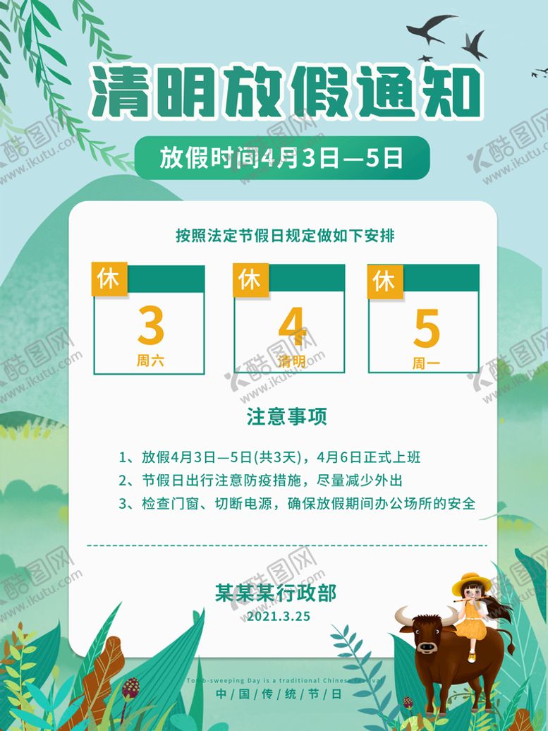 原创共享素材,尺寸大小是3544*4725像素,清明节放假通知是由平面广告设计师zhengyicai2010上传,浏览本次作品的您可能还对2022清明节,放假通知,清明,踏青,清明节海报,清明放假,清明放假通知,清明节促销,清明节背景,清明节踏青,清明节展板,清明节宣传单,清明海报,清明促销,清明节日,吊旗,展架,清明节素材,清明节广告,清明节设计,清明踏青,清明校园放假,清明节放假,通知,清明节祭祀,清明节通知,节日活动,清明节祭祖,,平面广告,,平面广告感兴趣。