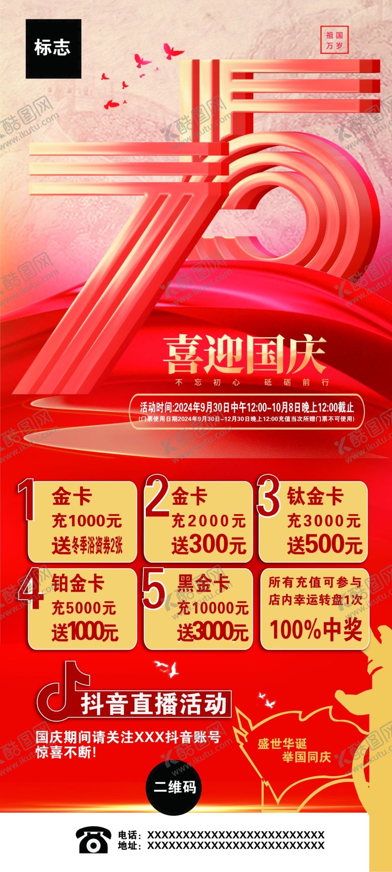 共享素材,尺寸大小是3151*7009像素,国庆展架设计是由平面广告设计师niitliu上传,浏览本次作品的您可能还对国庆,热烈,庆祝,胜利,活动,充值,周年,喜庆,红色,平面广告,,平面广告感兴趣。