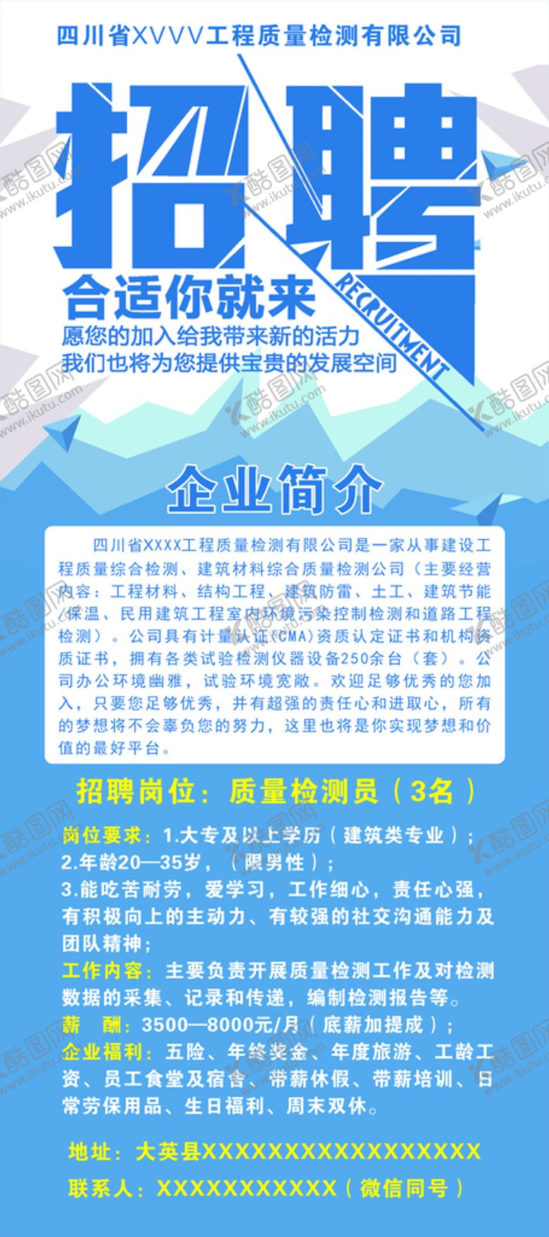 酷图网为你提供精美好看的素材模板下载,本次平面广告作品主题是招聘展架,素材ID编号是92057211042212296726,格式是CDR,建议使用打开编辑,或是"通过网上查询一下对应格式的打开软件";该招聘展架素材大小是1.74 MB,素材主要颜色以白色为主,素材分享方式属于