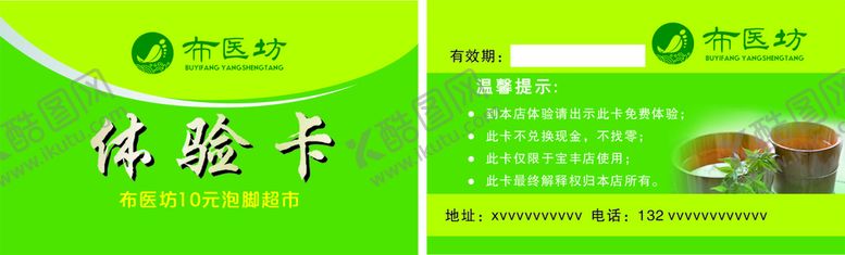 酷图网为你提供精美好看的素材模板下载,本次平面广告作品主题是布衣坊泡脚体验卡,素材ID编号是94048510151622539822,格式是CDR,建议使用打开编辑,或是"通过网上查询一下对应格式的打开软件";该布衣坊泡脚体验卡素材大小是718.08 KB,素材主要颜色以绿色为主,素材分享方式属于