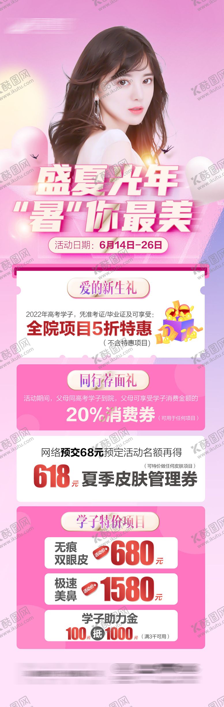 共享素材,尺寸大小是1080*6000像素,盛夏光年暑你最美医美促销长图是由平面广告设计师super_sxw777上传,浏览本次作品的您可能还对海报,长图,医美,整形,美容,暑期,盛夏,特价,优惠,人物,粉色,,平面广告,,平面广告感兴趣。