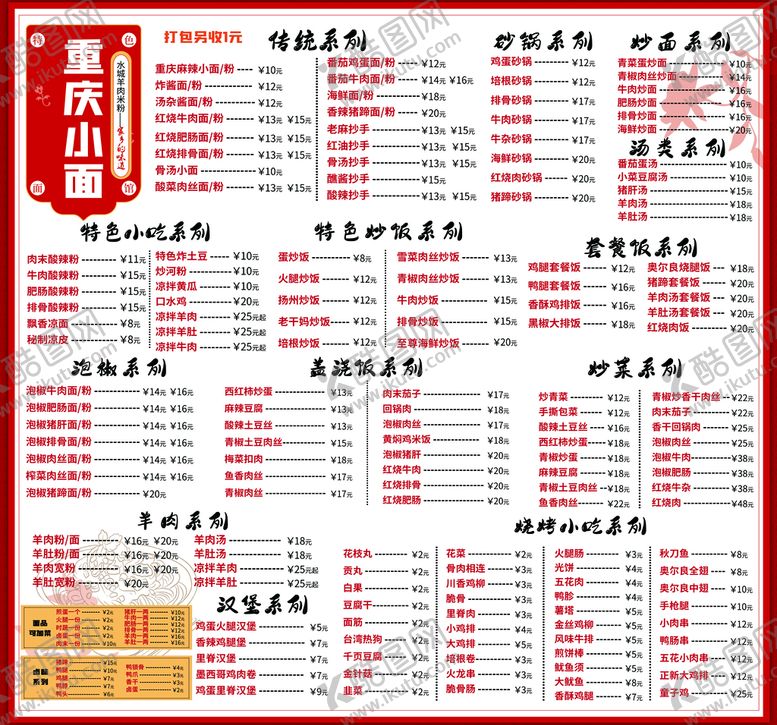 共享素材,尺寸大小是5906*5512像素,重庆小面 价目表是由平面广告设计师effielove0228上传,浏览本次作品的您可能还对价目表,重庆小面,点单,菜单,海报,,平面广告,,平面广告感兴趣。