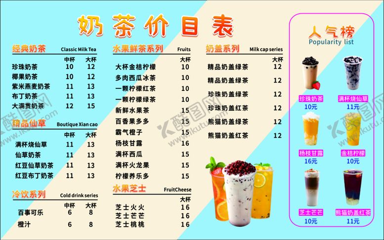 酷图网为你提供精美好看的素材模板下载,本次平面广告作品主题是奶茶价目表未转曲,素材ID编号是97565211071301158108,格式是CDR,建议使用打开编辑,或是"通过网上查询一下对应格式的打开软件";该奶茶价目表未转曲素材大小是74.72 MB,素材主要颜色以白色为主,素材分享方式属于