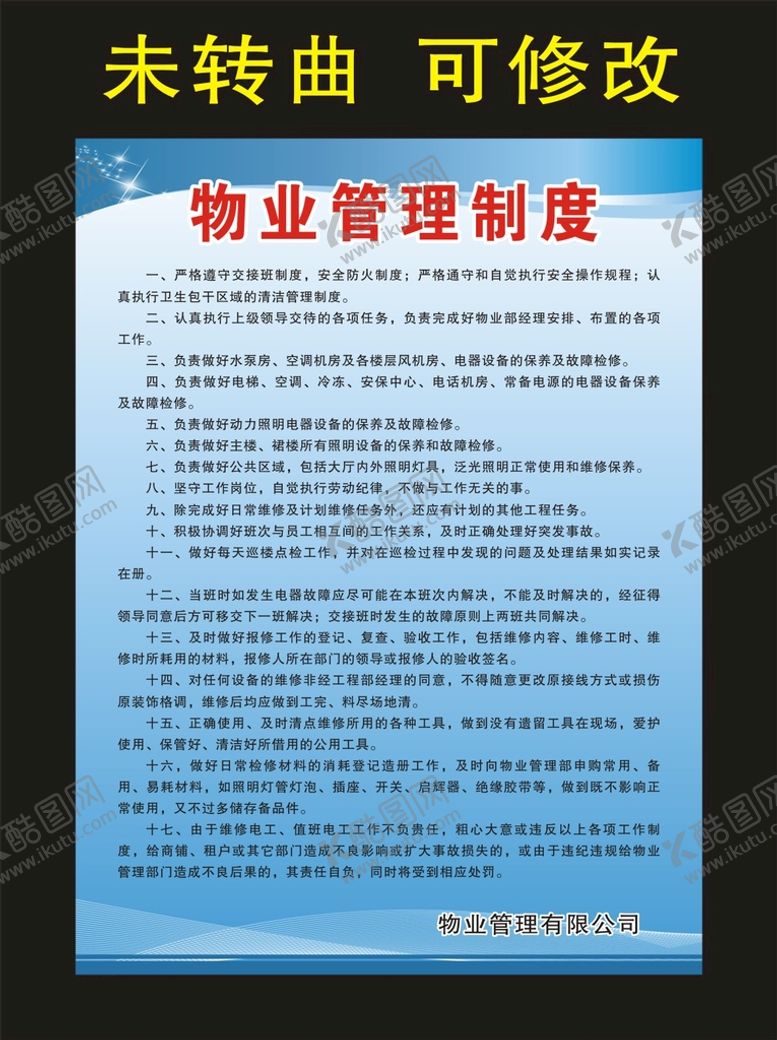 酷图网为你提供精美好看的素材模板下载,本次平面广告作品主题是物业管理制度 宣传海报,素材ID编号是99229510250458428566,格式是CDR,建议使用打开编辑,或是"通过网上查询一下对应格式的打开软件";该物业管理制度 宣传海报素材大小是944.15 KB,素材主要颜色以黑色为主,素材分享方式属于